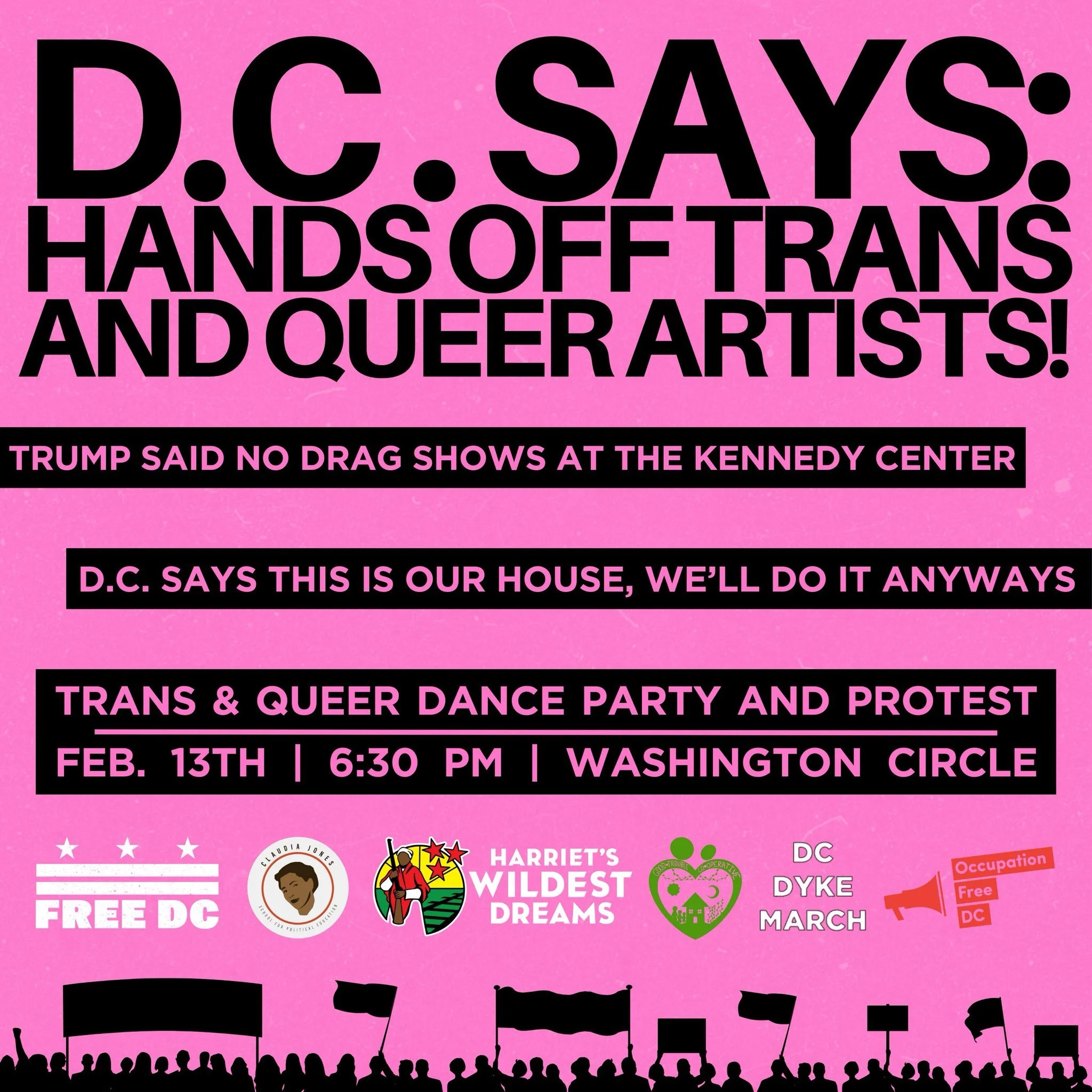 Join Free DC, Claudia Jones School, Harriet’s Wildest Dreams, Good Trouble Cooperative, Dyke March, Occupation Free DC and SPECIAL GUESTS for a joyful drag dance party and protest on Thursday,February 13 starting at 6:30 PM at Washington Circle. Let us know you’ll join us using the form below: