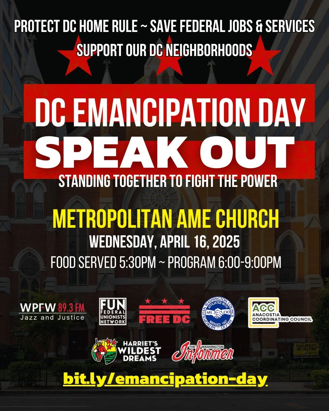 DC Emancipation Day celebrates the courage and struggle of individuals who have fought for freedom, and how this work is still needed now. As part of this year’s Emancipation Day celebrations, everyone is invited to “DC Emancipation Day Speak Out: Standing Together to Fight the Power,” a speak out on protecting Home Rule, saving federal jobs and services, and investing in local DC communities.