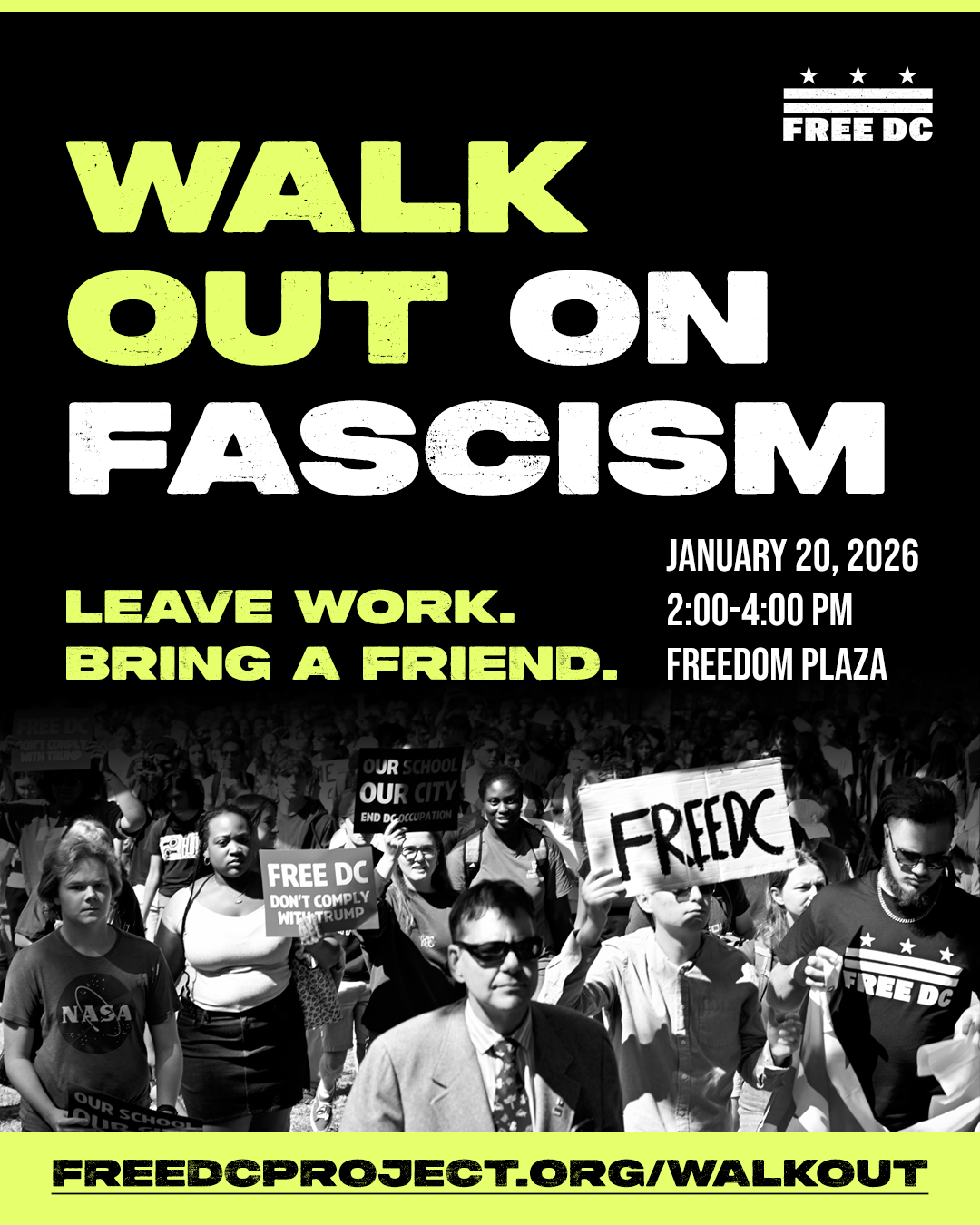 On January 20, 2026, we're calling on everyone who is sick of this administration's attacks on DC to leave work at 2:00 PM. Team up with friends, coworkers, or neighbors in your Ward to take this action together. Together, meet us at Freedom Plaza to show our power and participate in a special activity together. Pledge to participate using the form below to learn more.