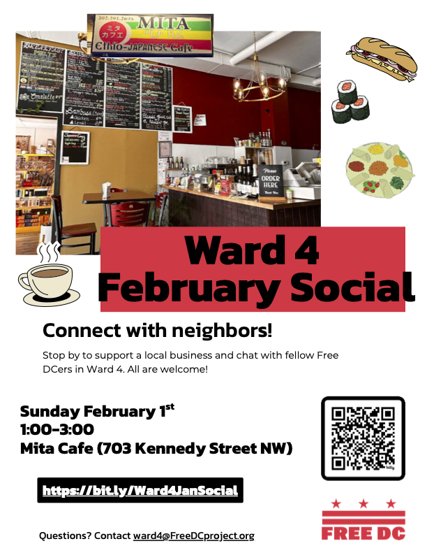 Join us for the first Ward 4 Monthly Social of 2026, a chance to meet and mingle with Free DC members from across Ward 4!
