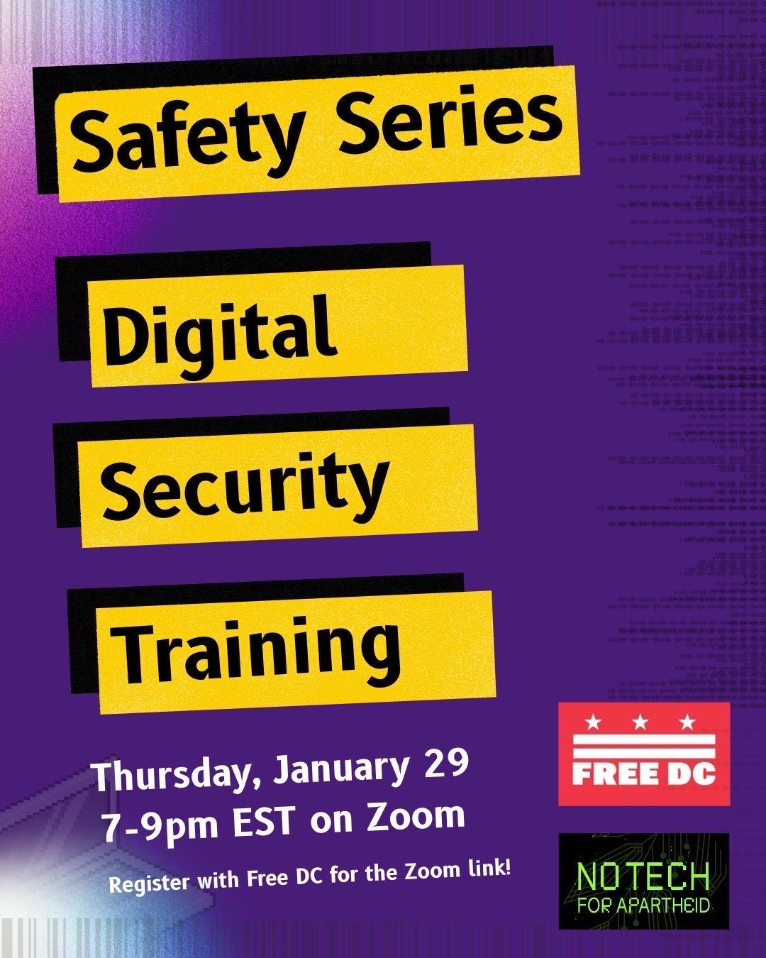 Everyone part of Free DC is encouraged to join this training with No Tech for Apartheid to understand practical strategies for secure digital spaces, as well as steps you can take to protect yourself while organizing. Register to join us on Thursday, January 29 from 7:00-9:00 PM EST on Zoom.