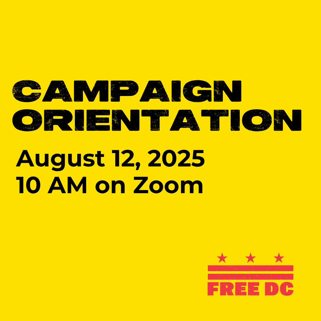 Throughout the course of this day, we will also run back-to-back Campaign Orientations. If you want to learn about Free DC’s organizing, join one of these sessions to learn about Free DC’s strategy, our structures, and how to get involved.