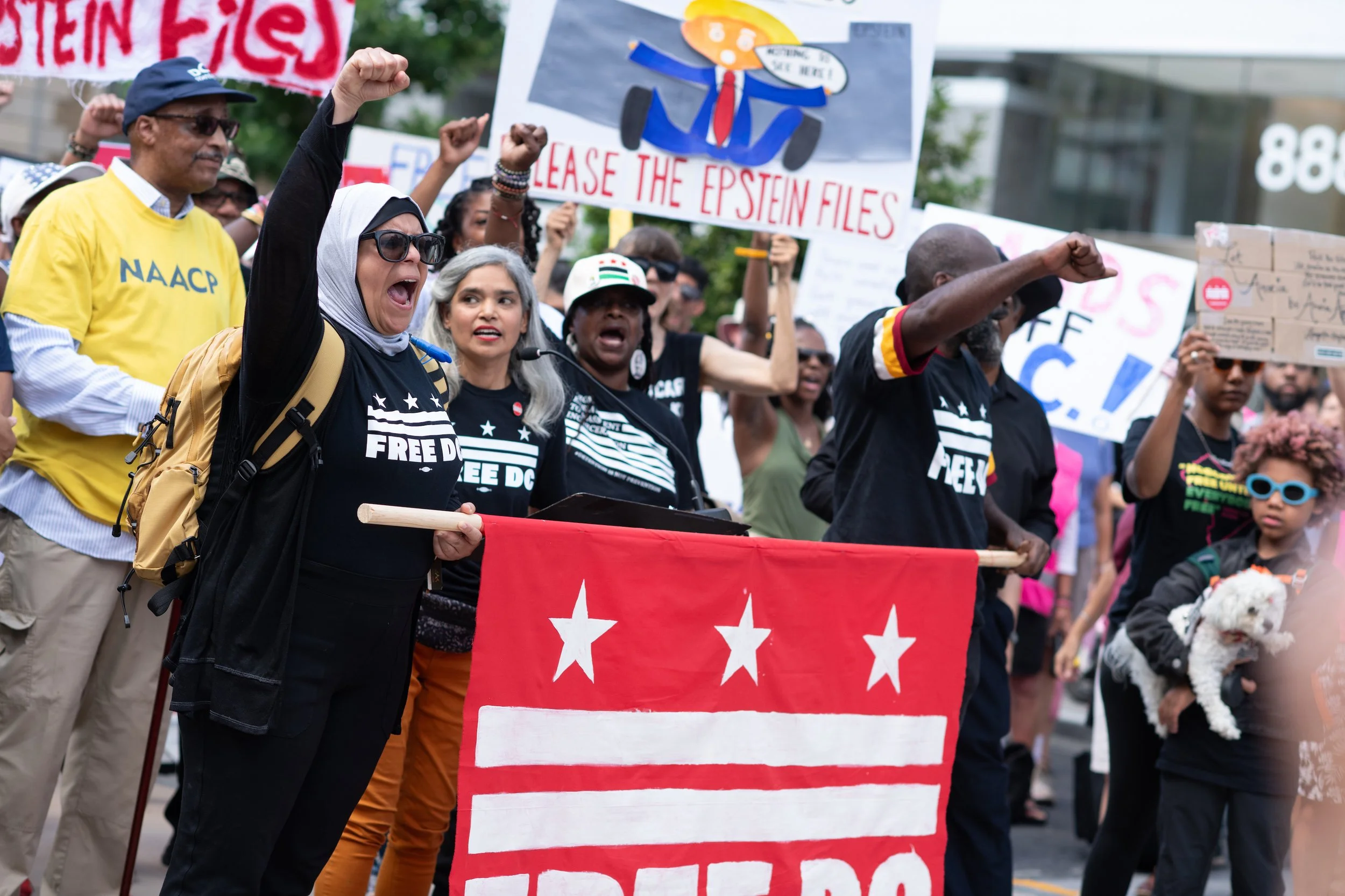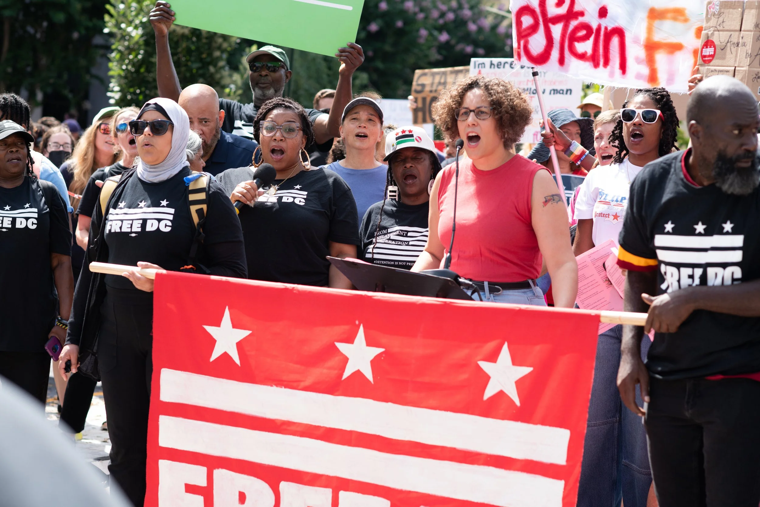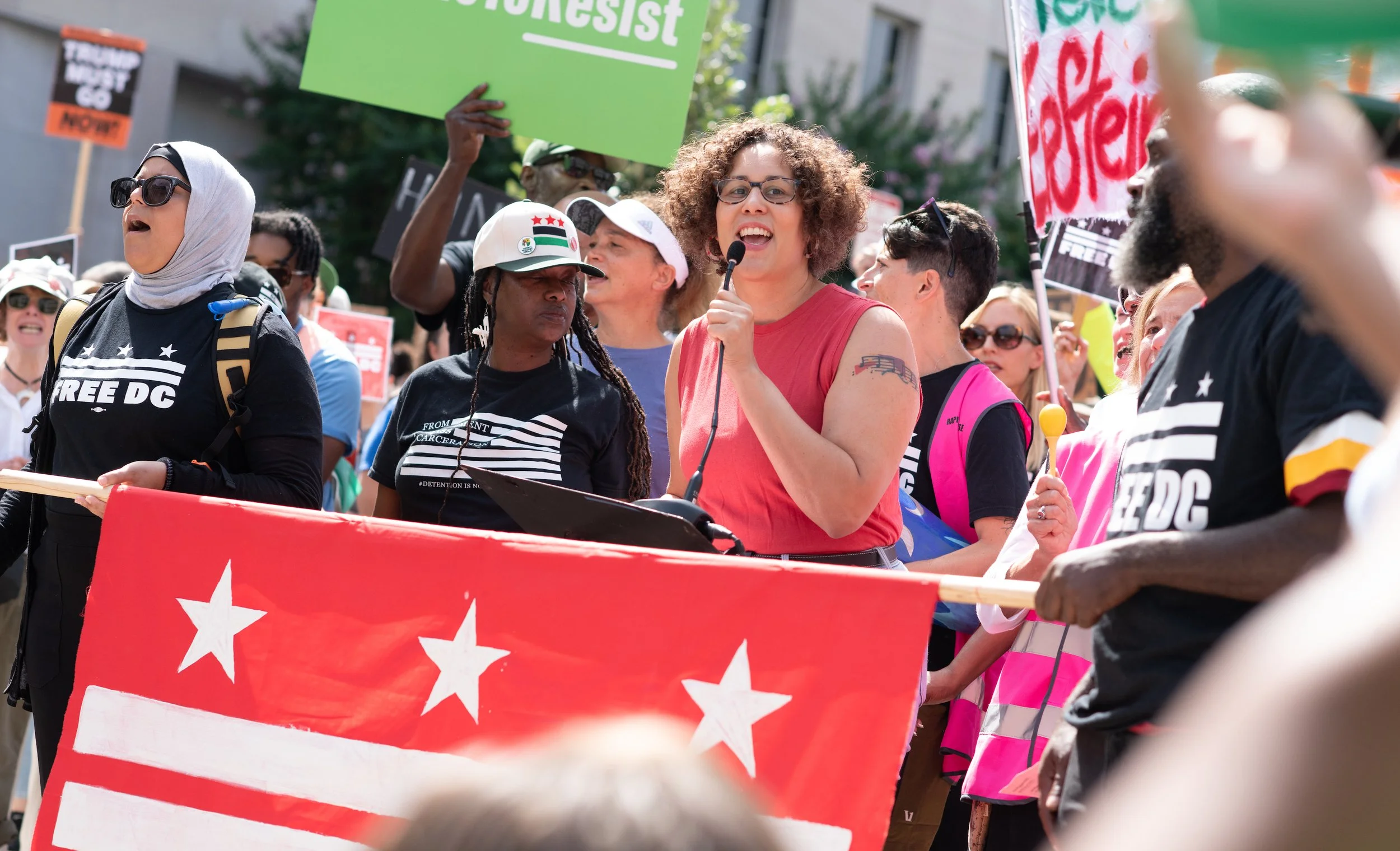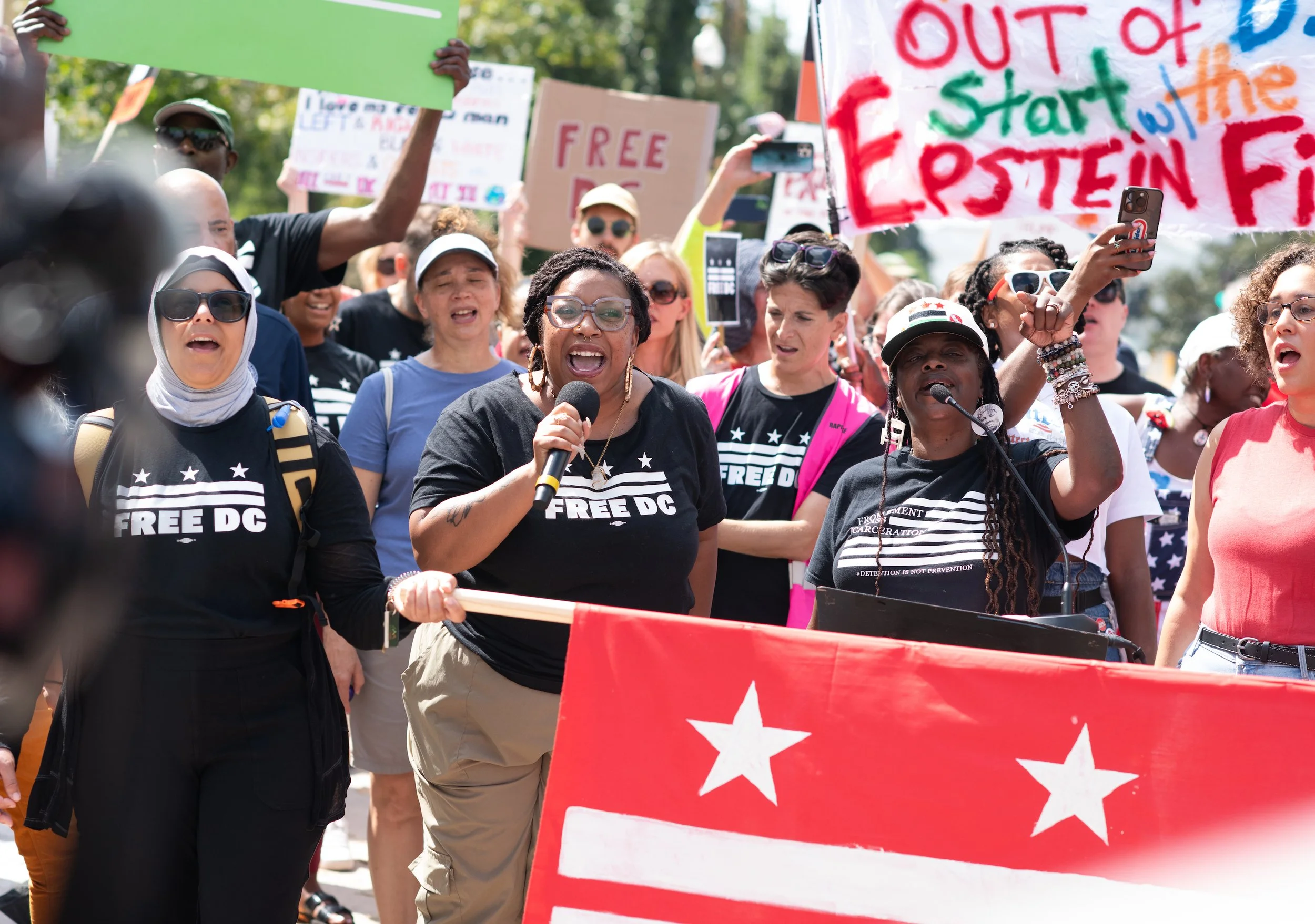 On Monday, August 11, 2025, Free DC held a press conference and rally downtown to oppose Trump’s planned federal takeover of DC. We gathered with our community, including speakers and collaborators from the Metropolitan Washington Council AFL-CIO, Colectivo de Familias Migrantes, National Homelessness Law Center, Black Swan Academy, Harriet’s Wildest Dreams, and the DC Rapid Reponse Choir, among others to make it loud and clear that DC belongs to its residents.