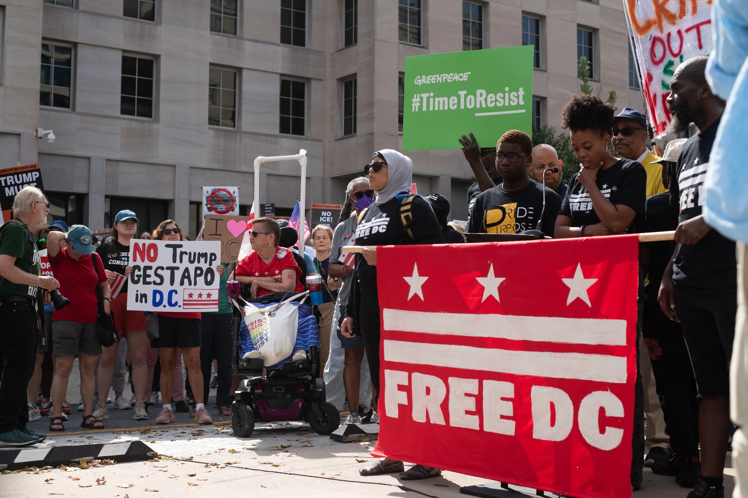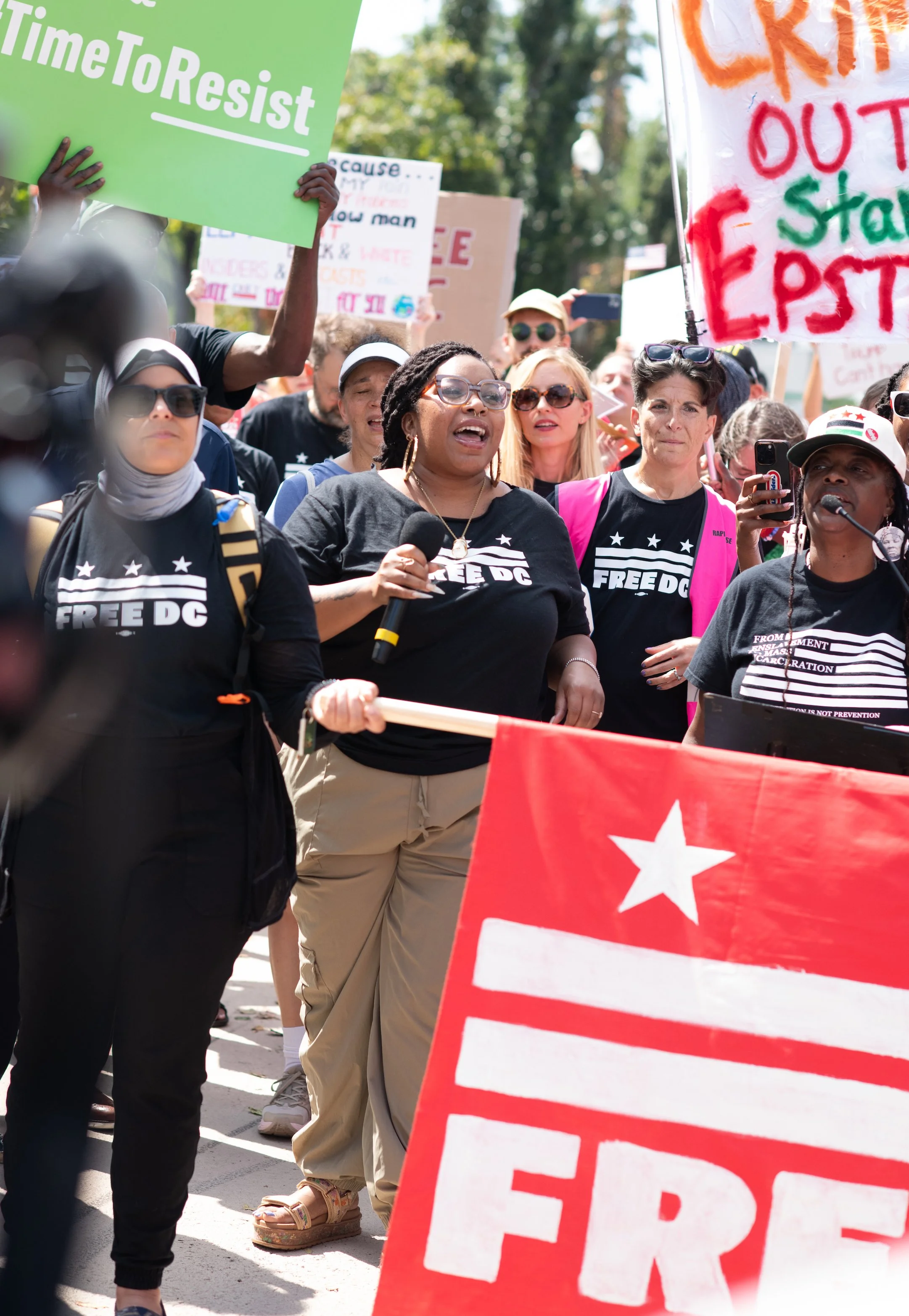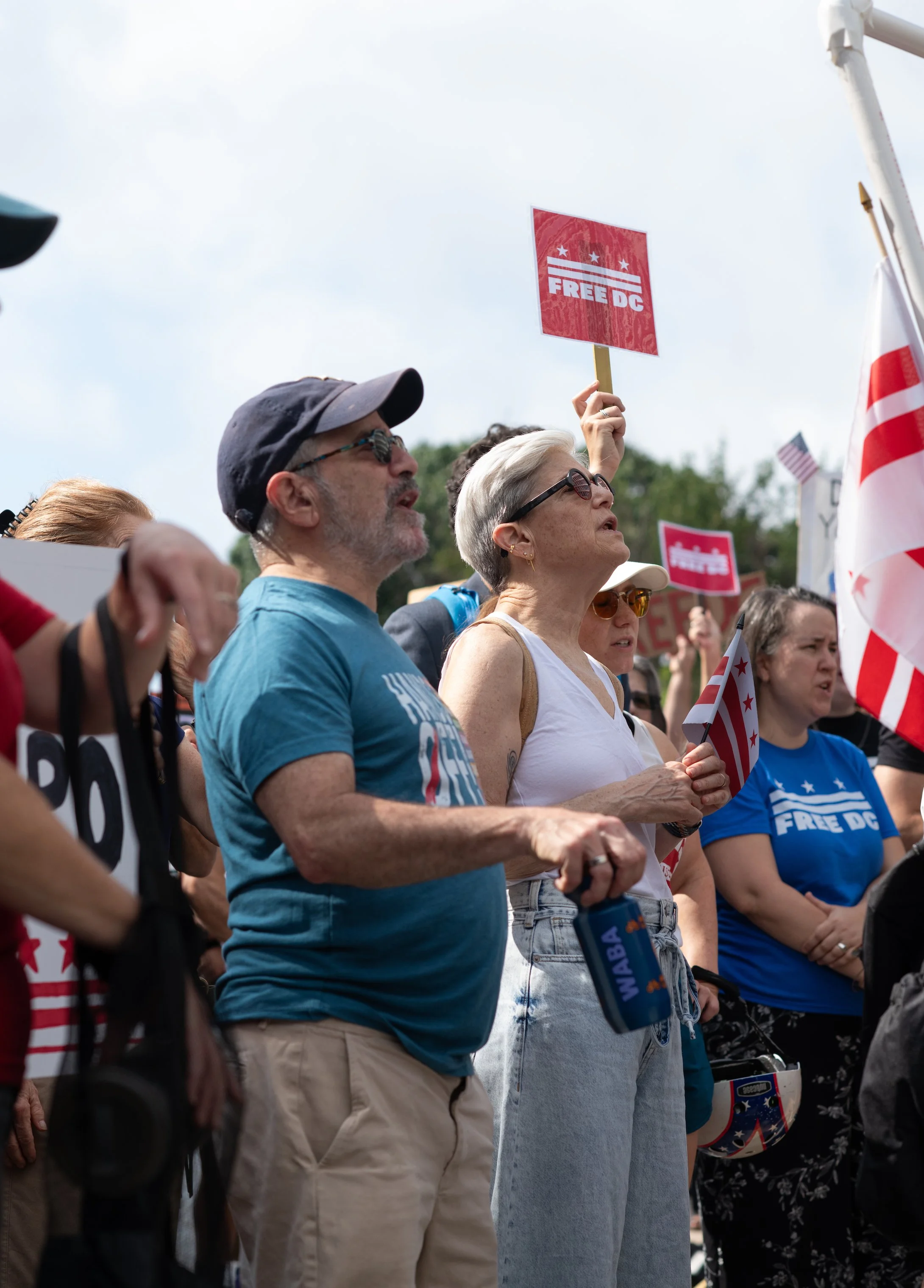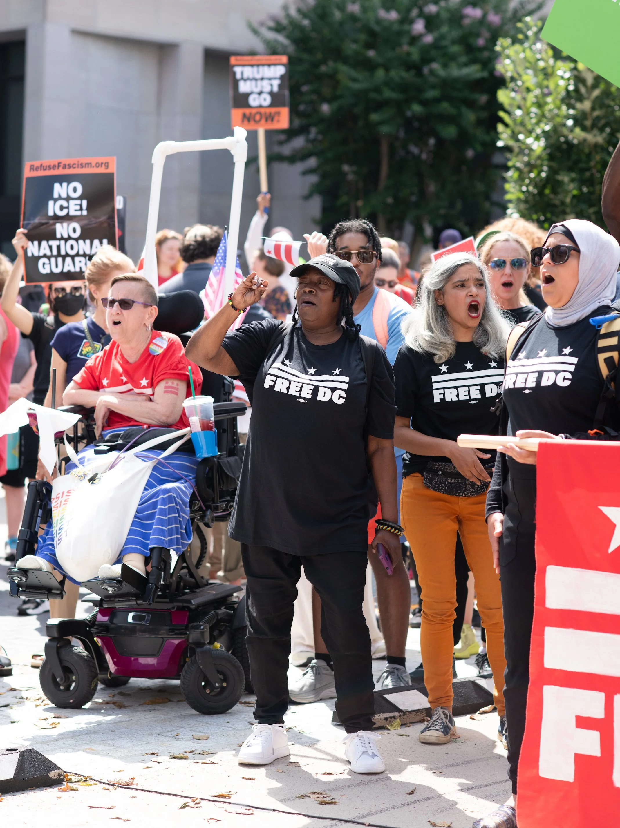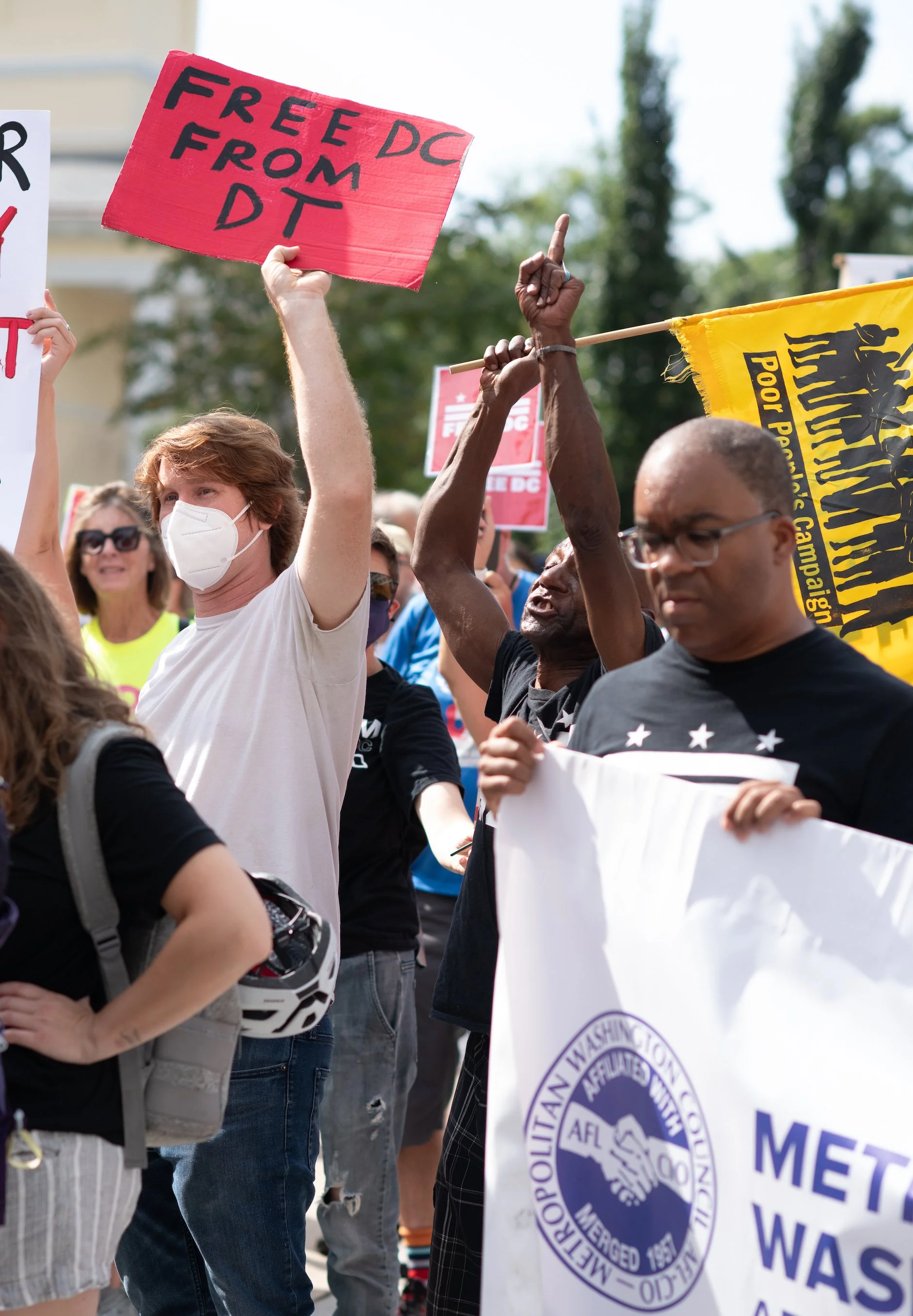 On Monday, August 11, 2025, Free DC held a press conference and rally downtown to oppose Trump’s planned federal takeover of DC. We gathered with our community, including speakers and collaborators from the Metropolitan Washington Council AFL-CIO, Colectivo de Familias Migrantes, National Homelessness Law Center, Black Swan Academy, Harriet’s Wildest Dreams, and the DC Rapid Reponse Choir, among others to make it loud and clear that DC belongs to its residents.