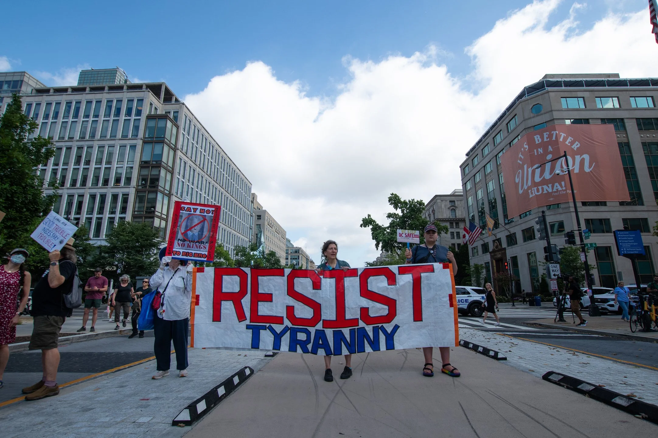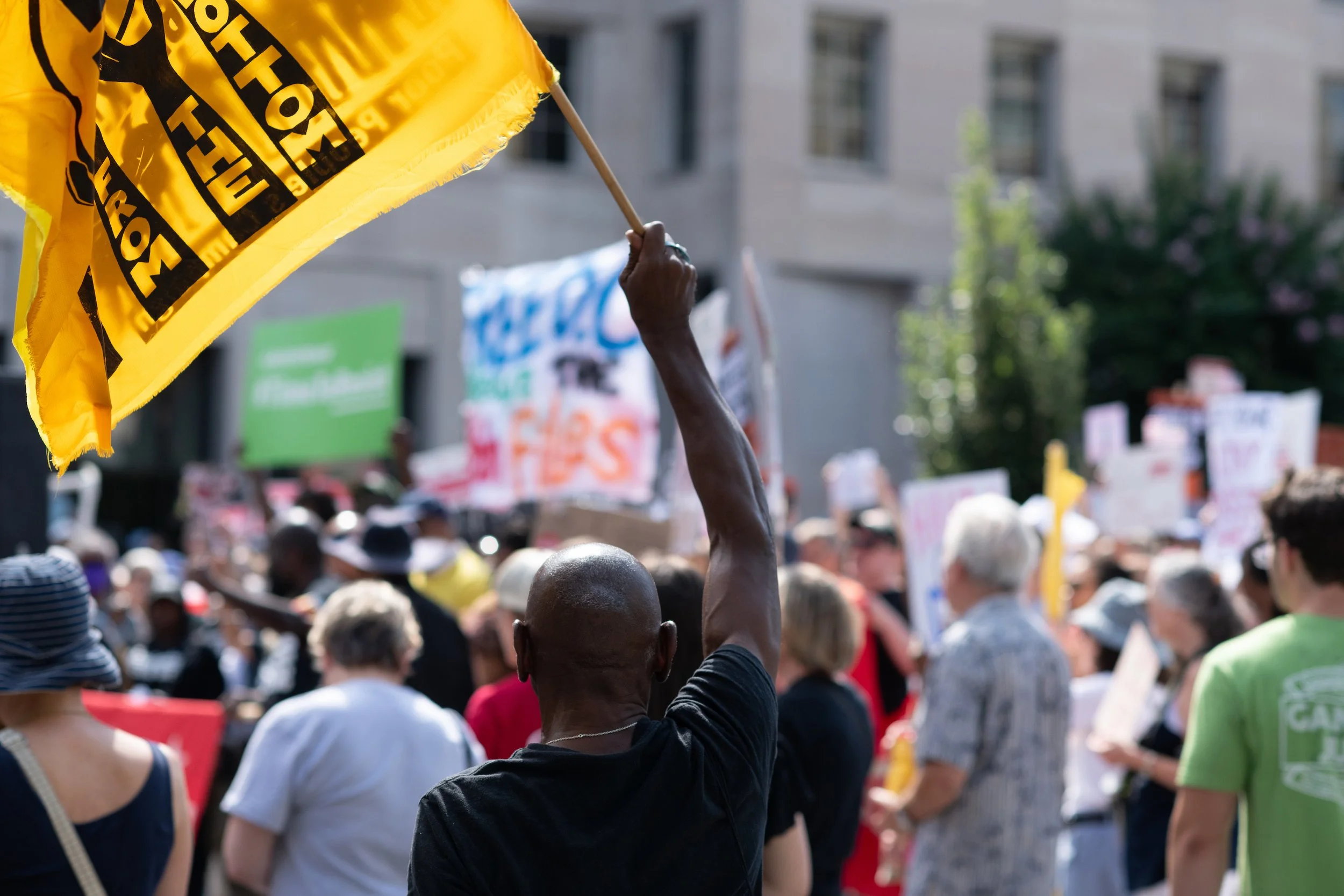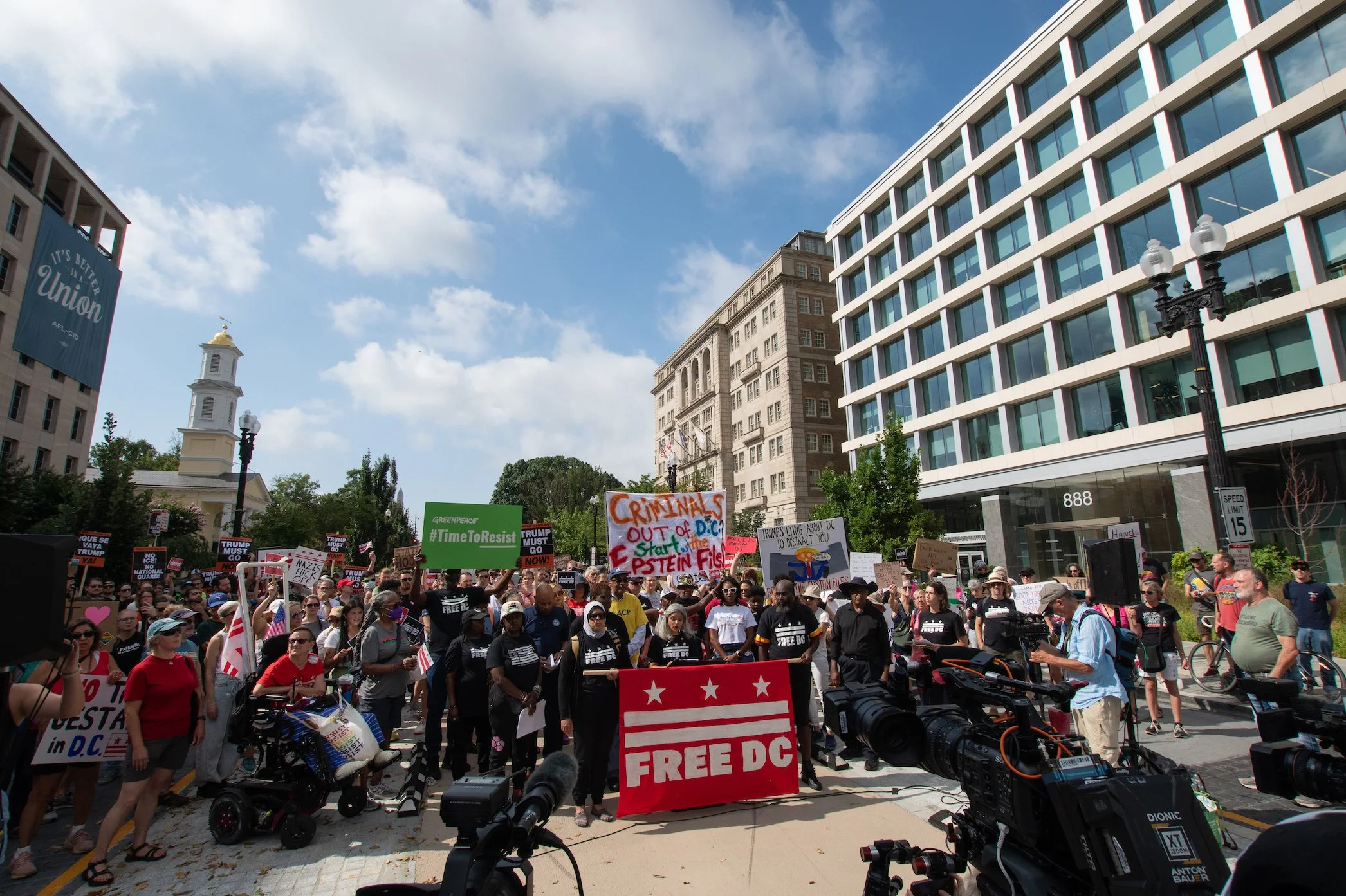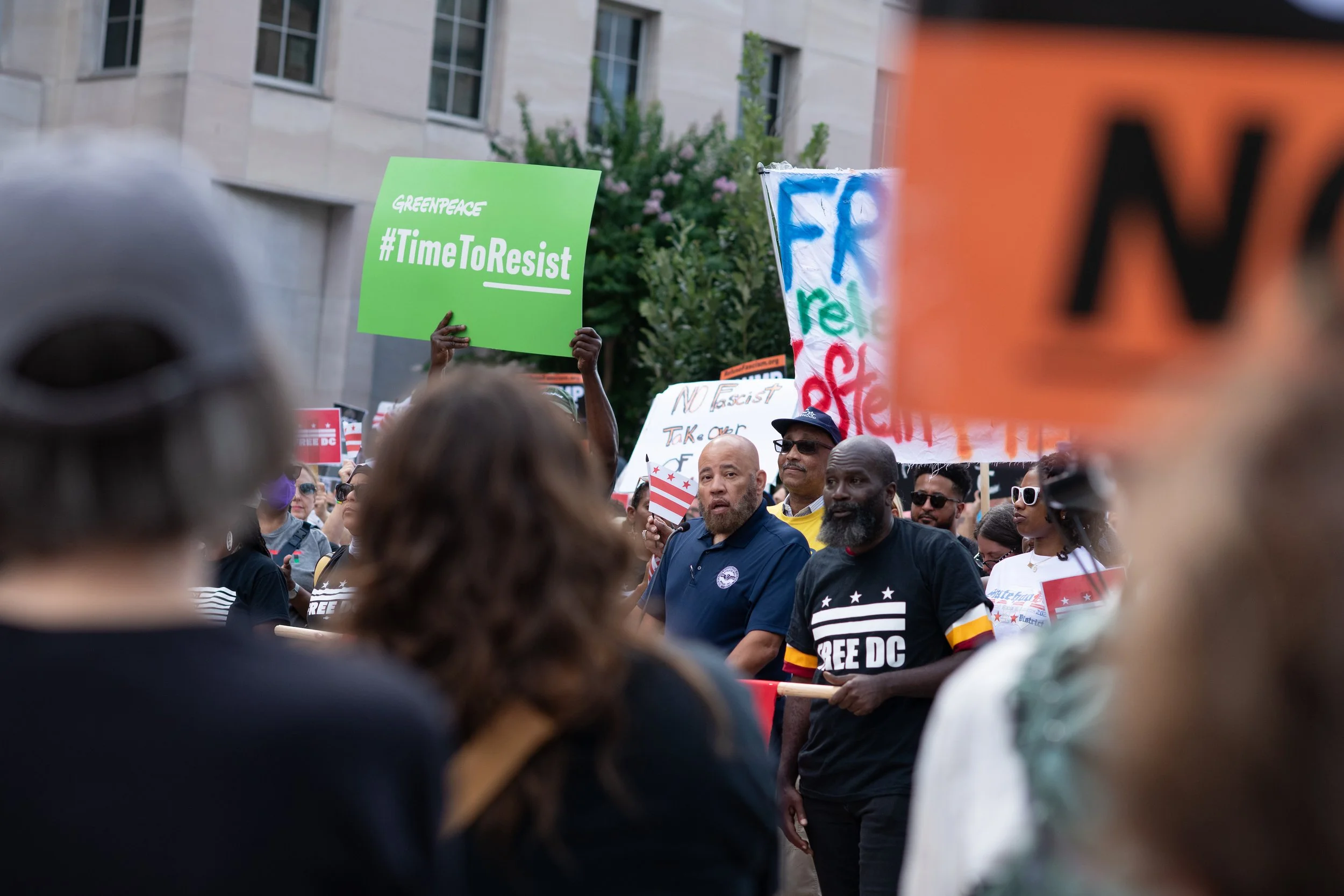 On Monday, August 11, 2025, Free DC held a press conference and rally downtown to oppose Trump’s planned federal takeover of DC. We gathered with our community, including speakers and collaborators from the Metropolitan Washington Council AFL-CIO, Colectivo de Familias Migrantes, National Homelessness Law Center, Black Swan Academy, Harriet’s Wildest Dreams, and the DC Rapid Reponse Choir, among others to make it loud and clear that DC belongs to its residents.